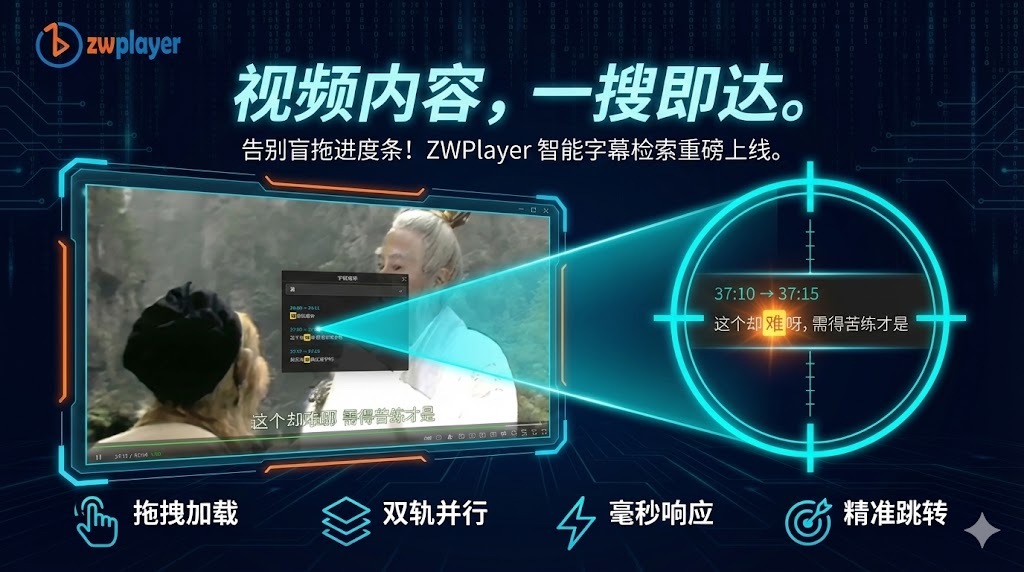 • ZWPlayer is a powerful free online player. New "Subtitle Search" black technology has been added, supporting real-time retrieval of dialogue and millisecond level jumps. Simultaneously compatible with dual external subtitle (SRT/VTT/BCC/JSON) drag and drop addition, AB loop, video recording, and volume enhancement, it is the preferred tool for online learning and audio-visual enthusiasts.